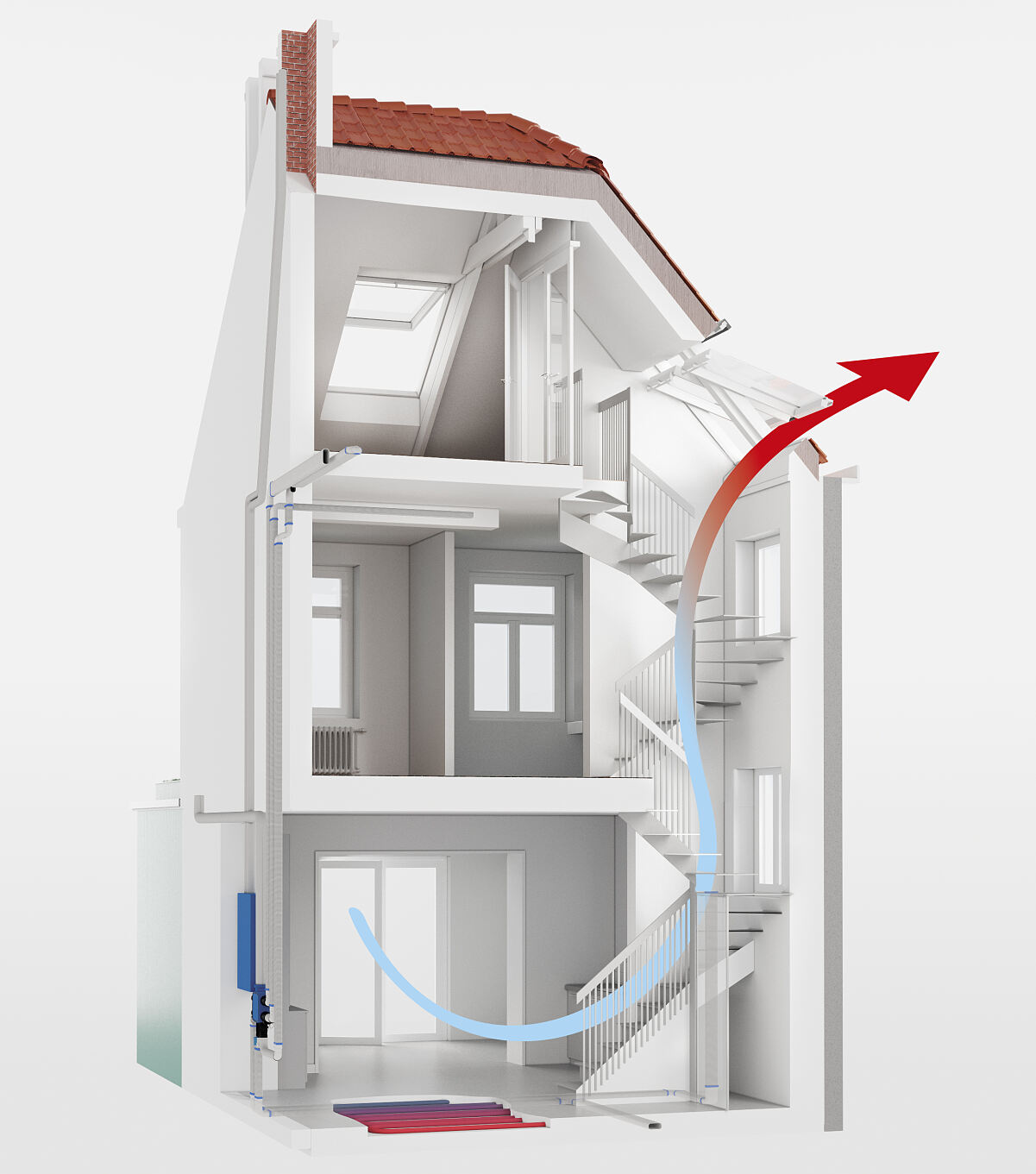 Im Idealfall sollten Fenster drei bis fünf Mal täglich für fünf bis zehn Minuten vollständig geöffnet werden, um einen effektiven Luftaustausch zu gewährleisten. Besonders effektiv ist die sogenannte Querlüftung, wenn mehrere Fenster gleichzeitig geöffnet werden und dadurch ein Luftzug entsteht. Noch besser: In mehrstöckigen Wohnungen entsteht durch das gleichzeitige Öffnen der Dach- und Fassadenfenster der sogenannte Kamineffekt. Dieser sorgt für einen schnellen und effizienten Luftaustausch.