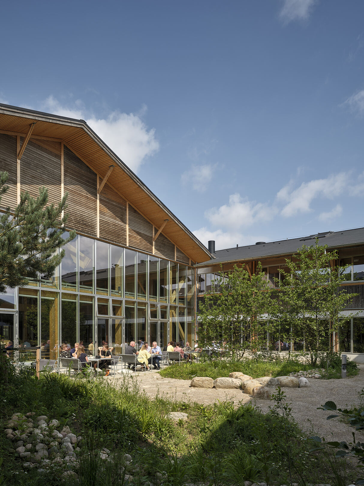 Betritt man das im Osten gelegene lichtdurchflutete Foyer, fällt sofort einer der großen begrünten Innenhöfe ins Auge. Dank der großflächig verglasten Fassaden ermöglicht er einen Ausblick in große Teile des Gebäudes und man erhält schnell einen Überblick, wo sich die unterschiedlichen Nutzungsbereiche befinden.