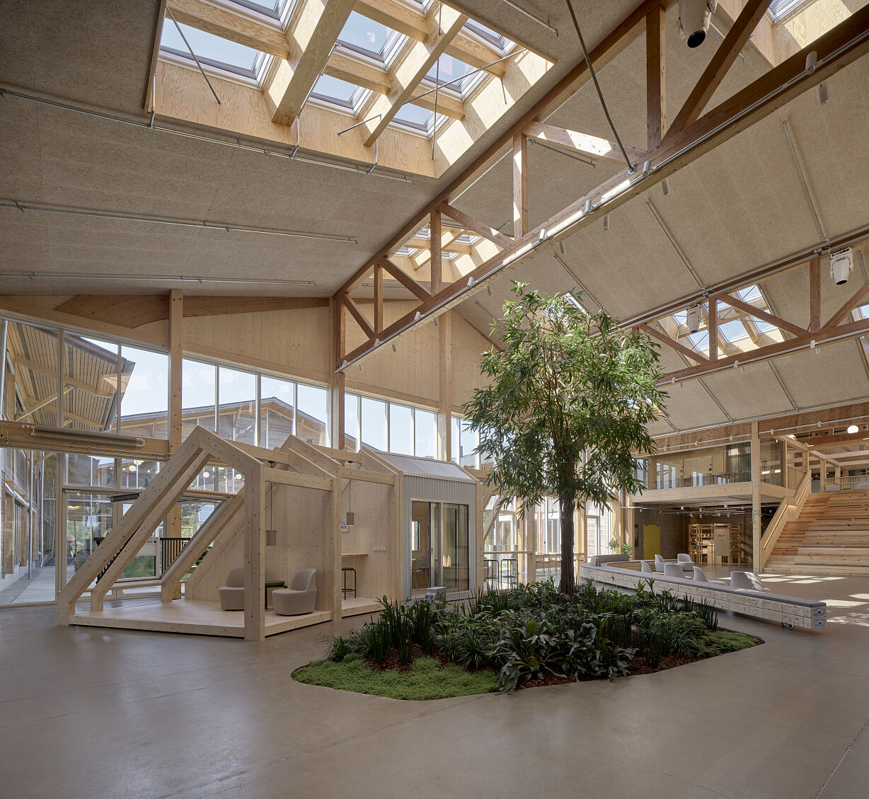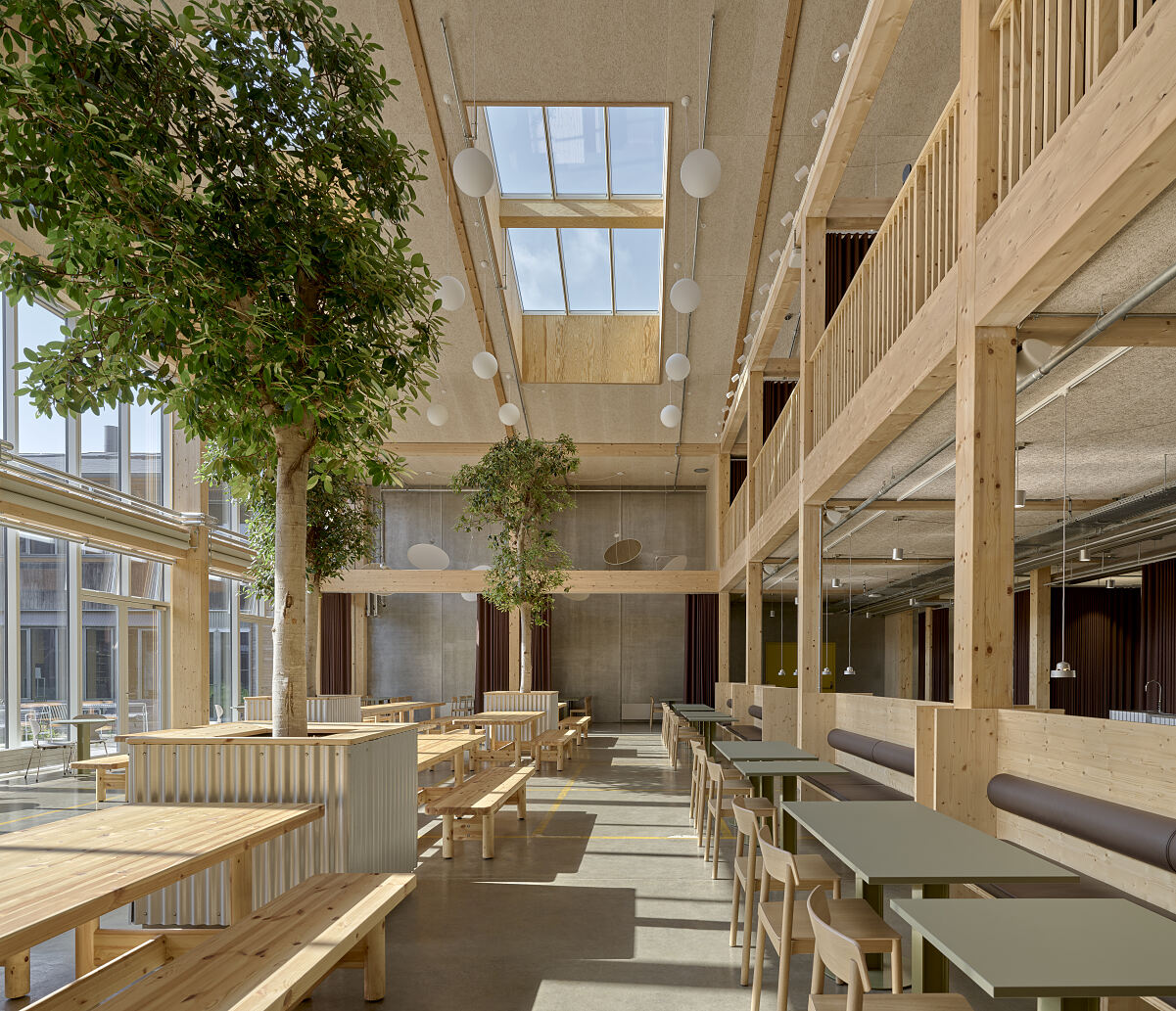 Im dänischen Østbirk ist mit dem Velux LKR Innovation House ein beeindruckendes Umbau-Projekt verwirklicht worden. Eine 30 Jahre alte Lagerhalle verwandelten Praksis Arkitekter in ein modernes Forschungs- und Entwicklungszentrum für den Dachfensterhersteller. Rund 500 Mitarbeitende der VELUX Gruppe arbeiten dort jetzt an der Weiterentwicklung von Dachfenstern und Zubehör sowie anderen Innovationen, die über die Kernprodukte des Unternehmens hinausgehen. Besonders bemerkenswert: Durch Nutzung des Bestands und Wiederverwendung von dessen Materialien konnten über 55 Prozent der Materialien, die für die Realisierung des LKR Innovation House als Neubau erforderlich gewesen wären, eingespart werden. Dadurch liegt der CO2-Fußabdruck deutlich unter dem vergleichbarer Gebäude in Dänemark.