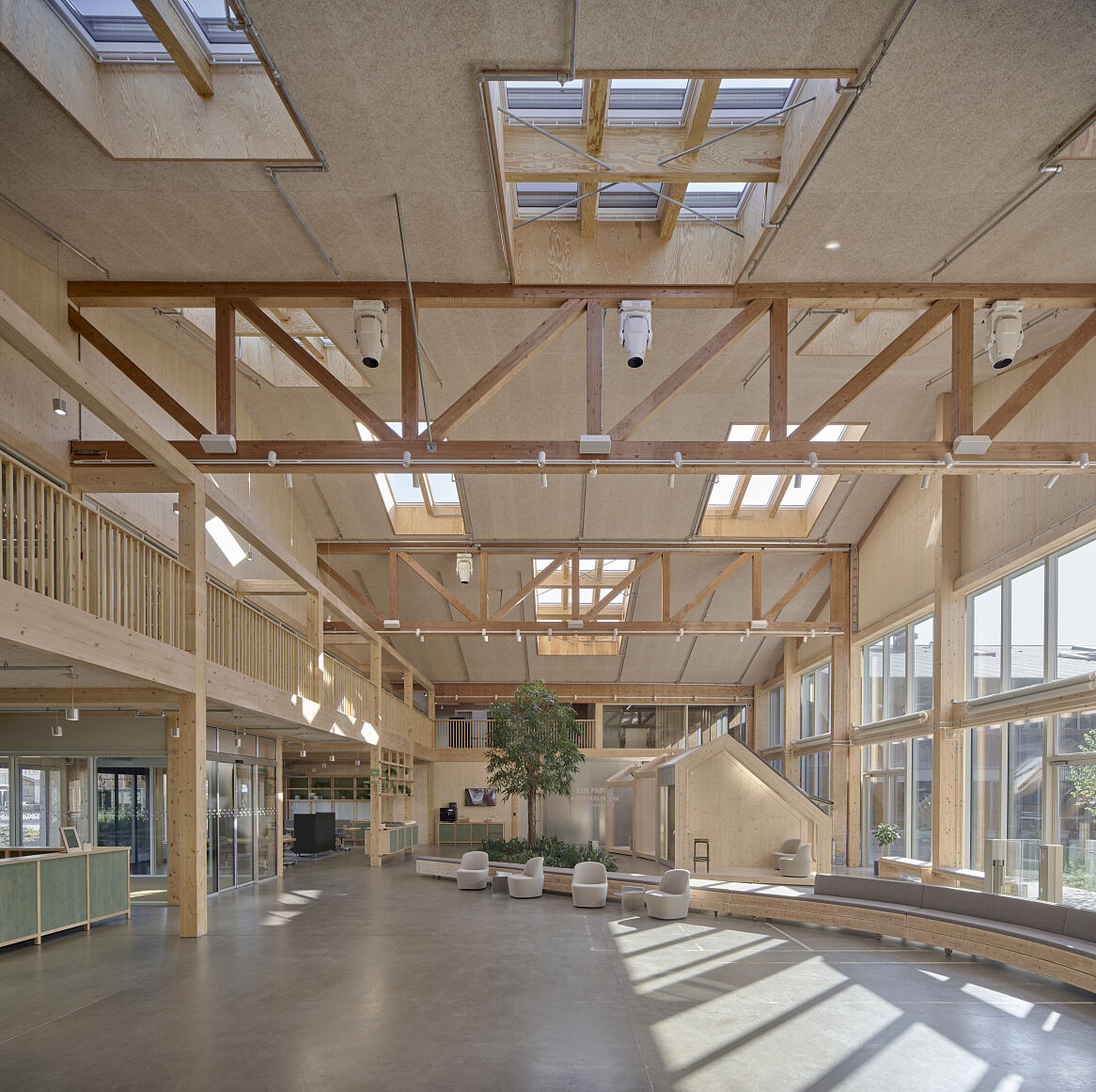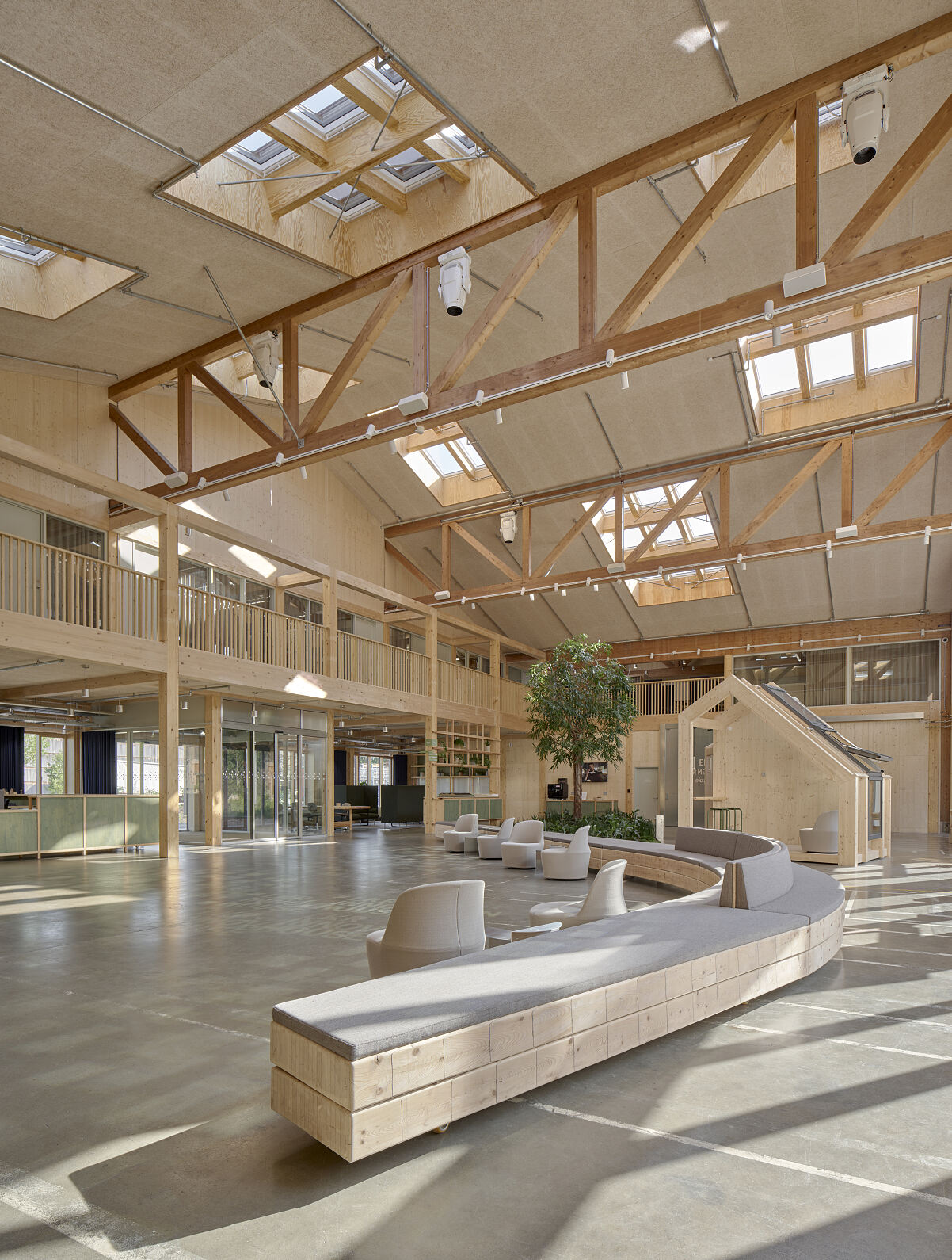 Das Foyer mit seiner hohen Decke dient als dynamische Fläche z. B. für Ausstellungen und Besprechungen sowie als Showroom, Lounge und Empfangsbereich. Es bietet eine direkte Verbindung zu den Werkstätten, den Büroräumen und dem Auditorium. Die Werkstätten befinden sich in dem Flügel links des Foyers und bieten vielfältige Möglichkeiten zur Präsentation von Innovationen. Zudem gewährleistet ihre Lage gute Bedingungen für Lieferungen von der Südfassade aus. Die Büroräume sind entsprechend der internen Zusammenarbeit einzelner Arbeitsfelder und je nach dem erforderlichen Grad an Vertraulichkeit angeordnet. Die meisten befinden sich im Flügel rechts des Foyers an der Nordfassade, sodass sie eine schöne Aussicht bieten, ohne sie vor direkter Sonneneinstrahlung schützen zu müssen. Weitere Arbeitsplätze sind in Nischen und vielen kleinen Zonen neben offenen Bereichen in großen Teilen des Gebäudes zu finden. Wer vom Eingang aus zweimal rechts geht, erreicht das Forum – ein Schauplatz für ständig wechselnde Veranstaltungen, Vorträge und Konferenzen, die Menschen aus aller Welt zusammenbringen.